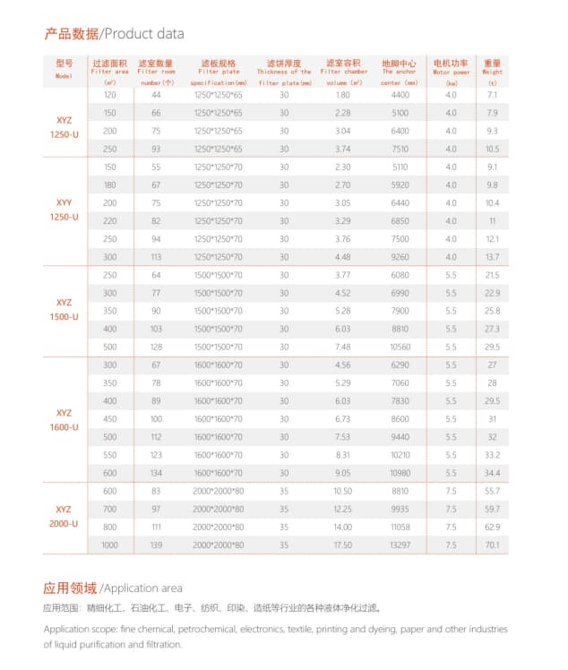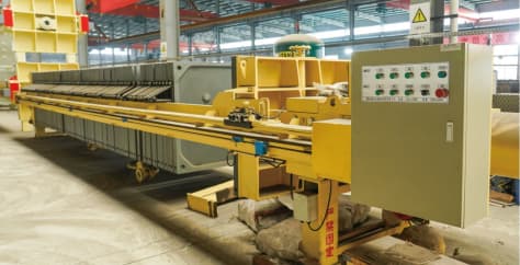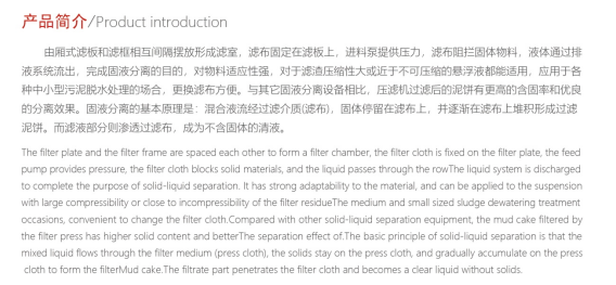 簡介—— 由箱式濾板和濾框相互間隔擺放形成濾室,濾布固定在濾板上,進料泵提供壓力,濾布阻攔固體顏料,液體通過排液系統流出,完成固液
